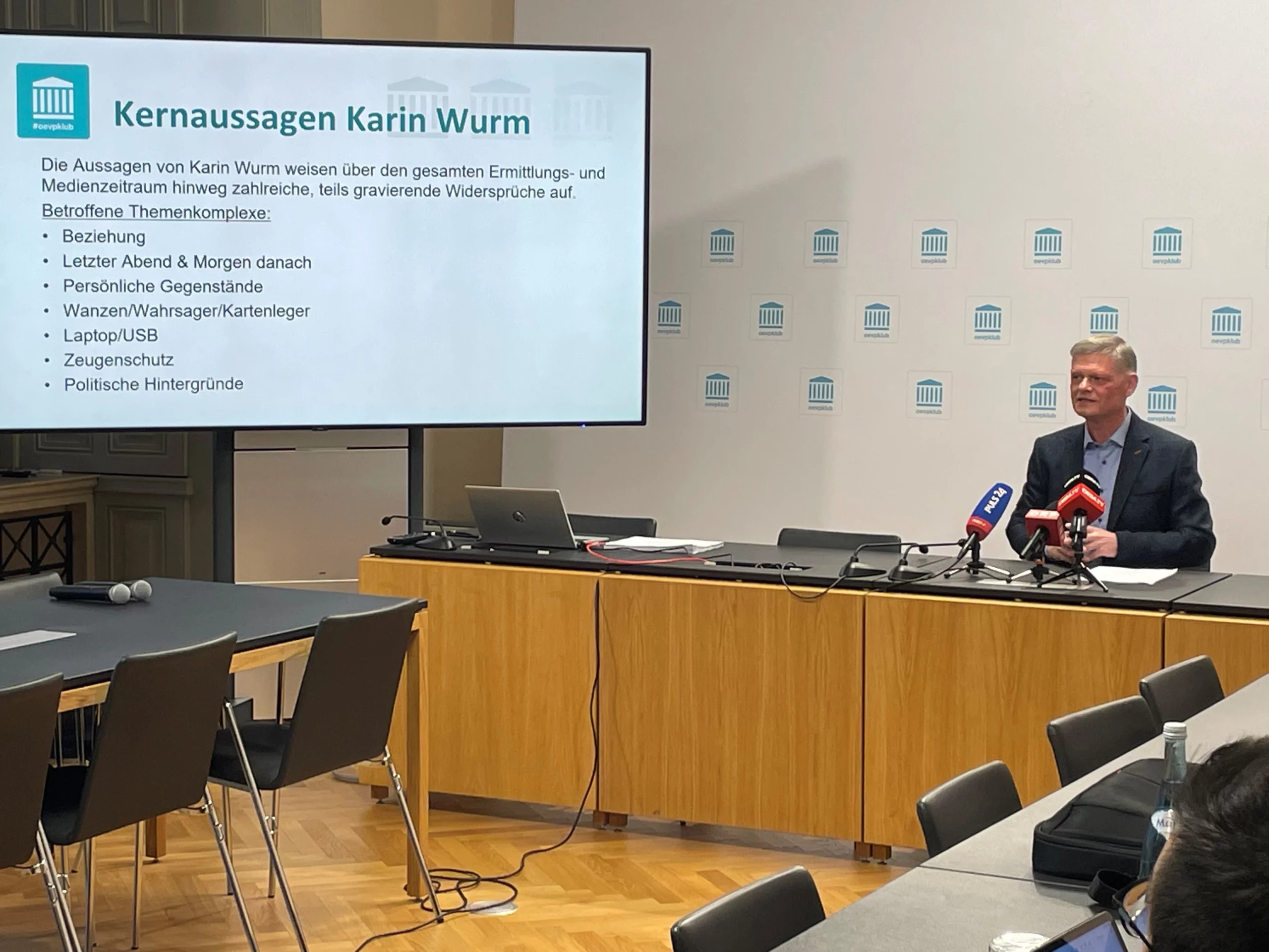 Diese Widersprüche und mehrfache Versionen durch Wurm betreffen die Beziehung, den letzten Abend im Leben des Christian Pilnacek und den Morgen nach seinem Ableben und die Fragen zu persönlichen Gegenständen. Weitere Widersprüche zeigen sich in den Aussagen Wurms zu behaupteten Abhör-Wanzen in ihrem Haus, zu einem angeblichen Zeugenschutzprogramm und zu ebenfalls nur behaupteten politischen Hintergründen. Auch zum Laptop und einem USB-Stick von Pilnacek sowie Bargeld und ein Sparbuch „gibt es keine konsistente Bestätigung“, sagt der ÖVP-Fraktionsführer.