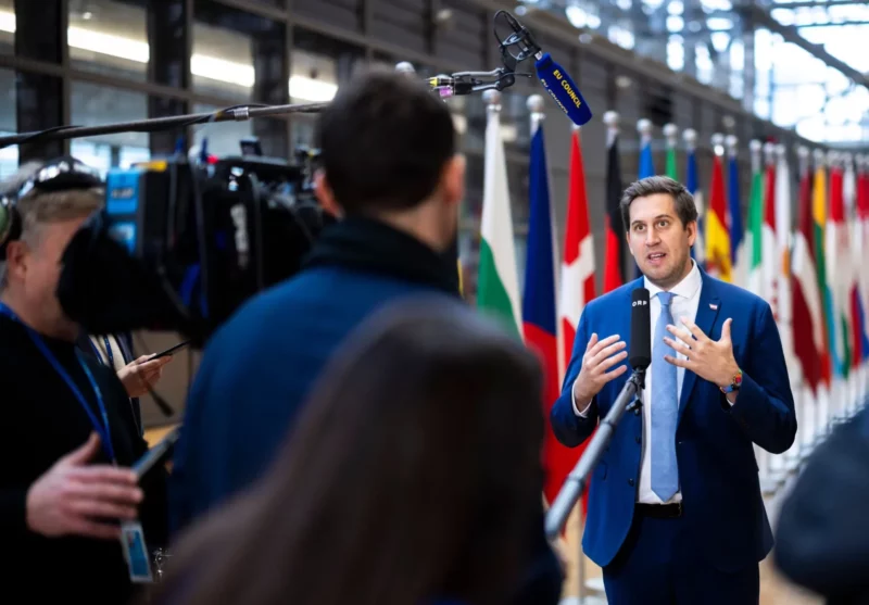 Digitalisierungsstaatssekretär Alexander Pröll vertrat Österreich beim Rat für „Verkehr, Telekommunikation und Energie“ der EU in Brüssel. Neben einem Doorstep für Medien stand auch ein bilateralen Gespräch mit der französischen Ministerin für Künstliche Intelligenz Anne Le Hénanff auf dem Programm. Foto: BKA/Christopher Dunker