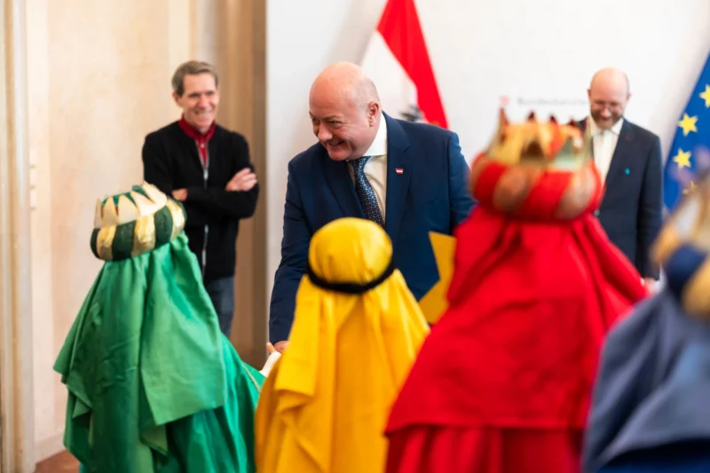 Die Sternsinger ziehen dieser Tage wieder durch das Land und bringen den Segen Gottes in die Häuser. Auch im Bundeskanzleramt schauten Sternsinger der Pfarre Maria Lanzendorf vorbei und wurden dort persönlich von Bundeskanzler Christian Stocker begrüßt und in Empfang genommen. Foto: BKA/Christopher Dunker.
